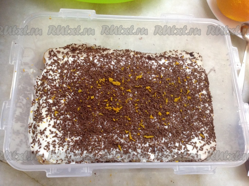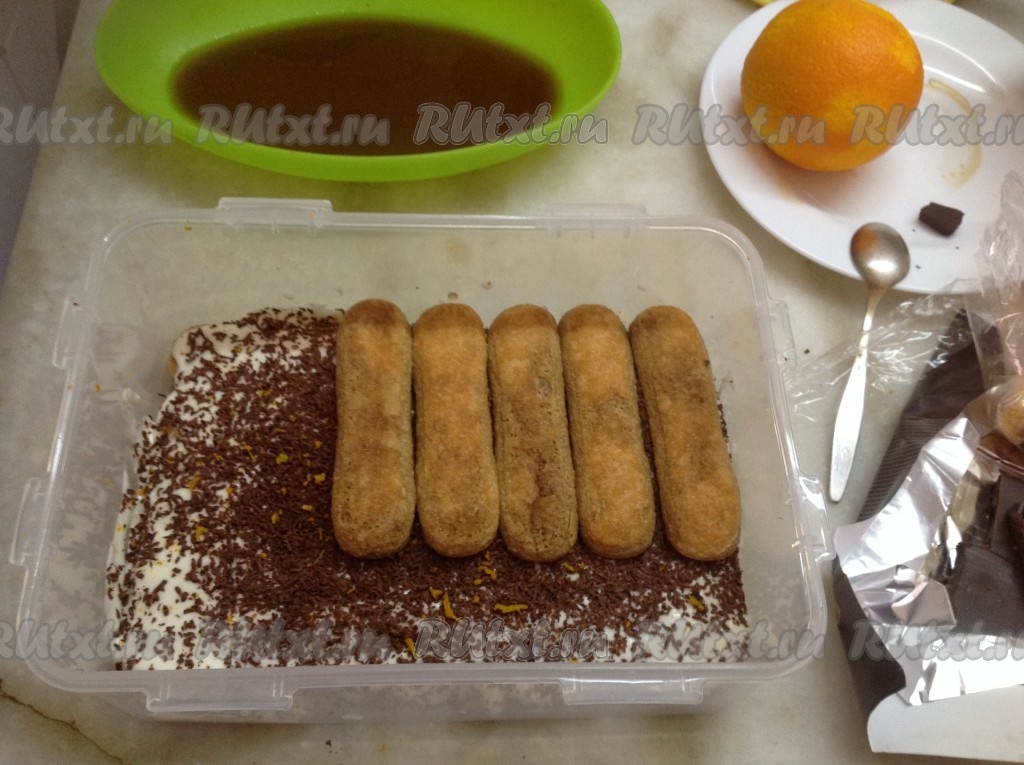 Выложить поверх второго слоя печенья оставшийся взбитый сыр Маскарпоне, посыпать тертым шоколадом и цедрой.