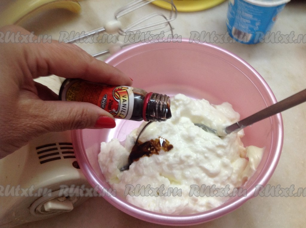 Сыр Маскарпоне выложить в миску, соединить с йогуртом, добавить ванильный экстракт и сахар.