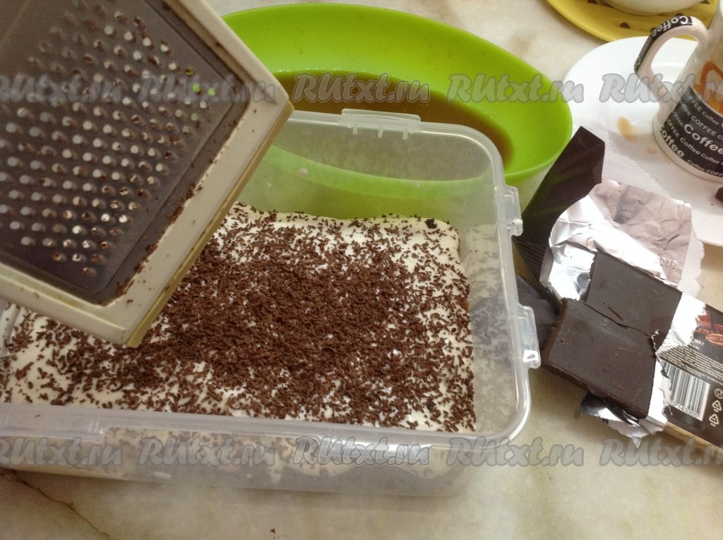 Налить кофе с ликером в ёмкость, опускать в неё печенье на 1-2 секунды, чтобы не промокало сильно (иначе развалится) и выкладывать в прямоугольную форму.