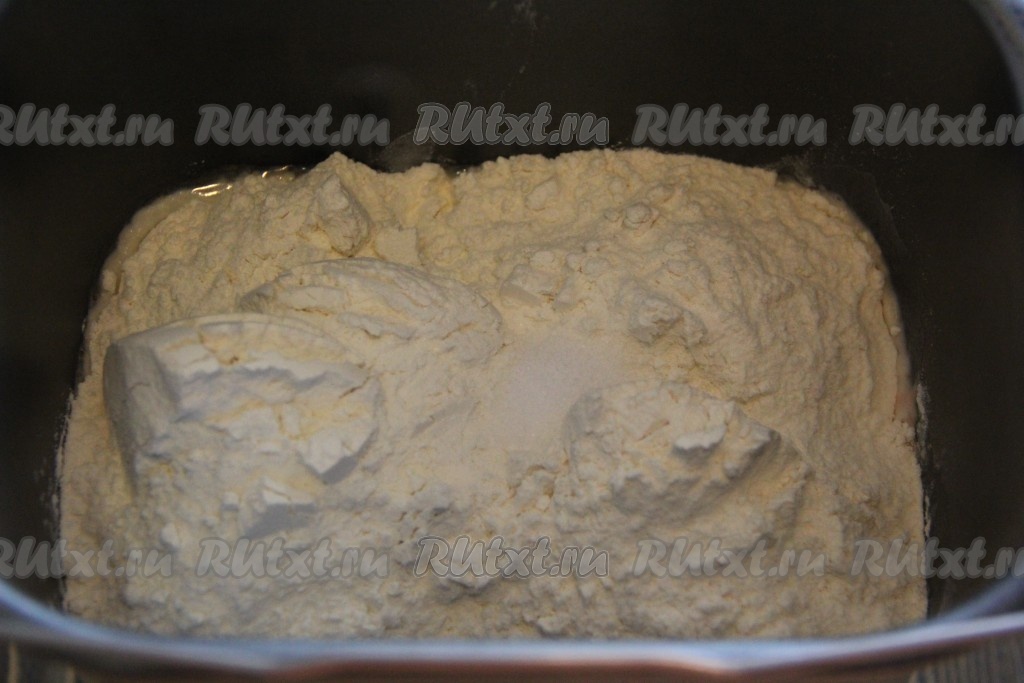 В ведёрко хлебопечки влить тёплую воду, всыпать сахар и дрожжи, оставить на 15 минут.