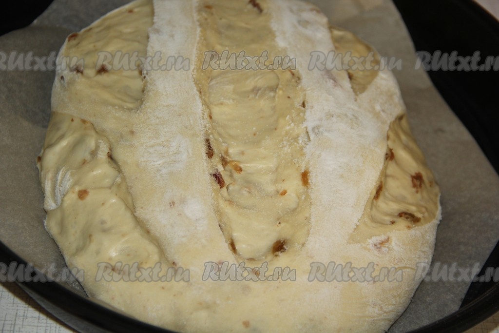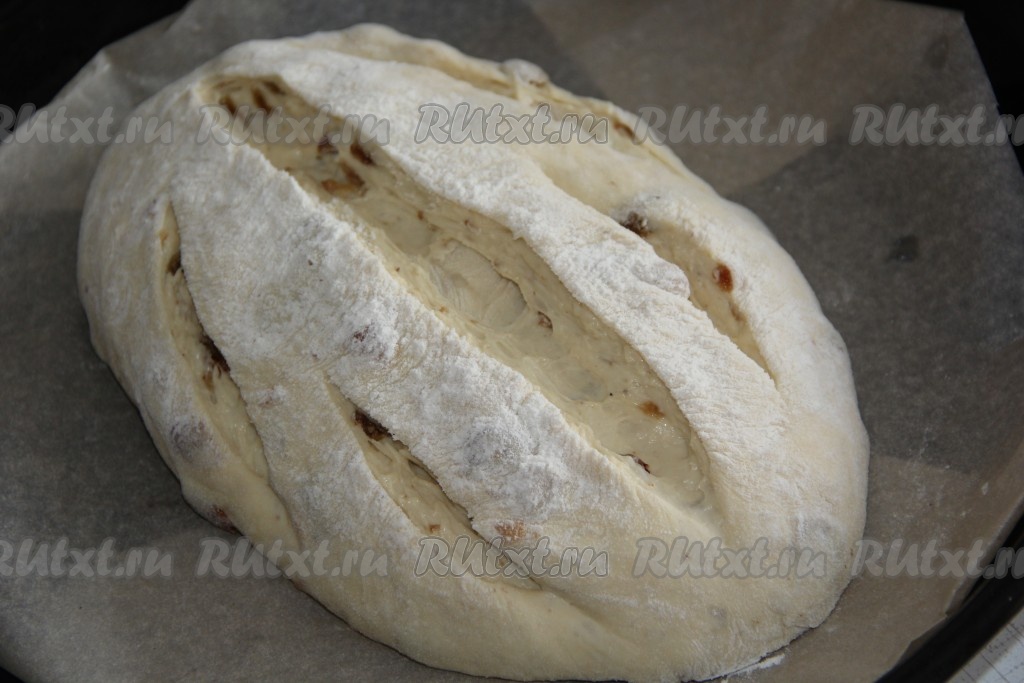 Переложить батон на противень, застеленный пергаментом. Сделать острым ножом глубокие надрезы. Оставить батон на 45 минут под полотенцем.