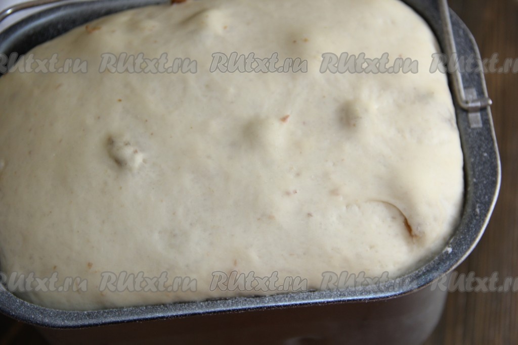 Выставить режим хлебопечки "Замес теста", он занимает у меня 1,5 часа. Изюм обдать кипятком и обсушить, по звуковому сигналу добавить его в хлебопечку. Тесто в хлебопечке в результате замешивания хорошо поднимется. Если вы готовите тесто руками, тогда в тёплой воде нужно растворить дрожжи и сахар, минут через 15, когда на поверхности появятся пузырьки, добавить растительное масло, муку и соль. Замесить нежное тесто, в конце замеса добавить изюм и вмешать его в тесто. Накрыть тесто полотенцем, оставить на 1,5 часа в тепле для подхода, тесто хорошо поднимется.