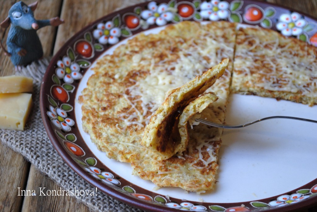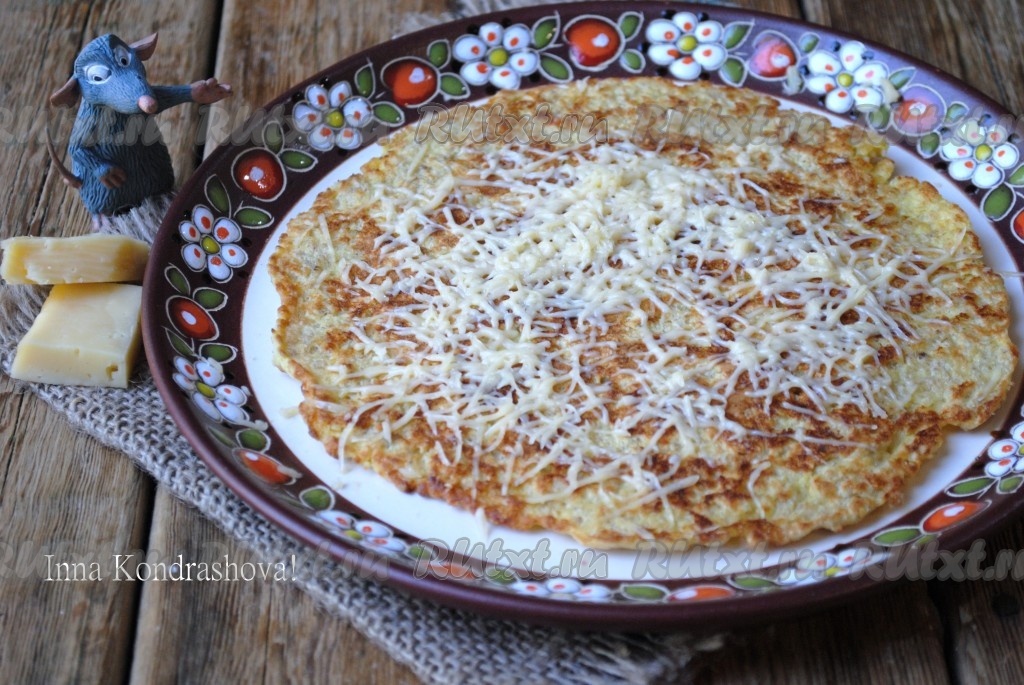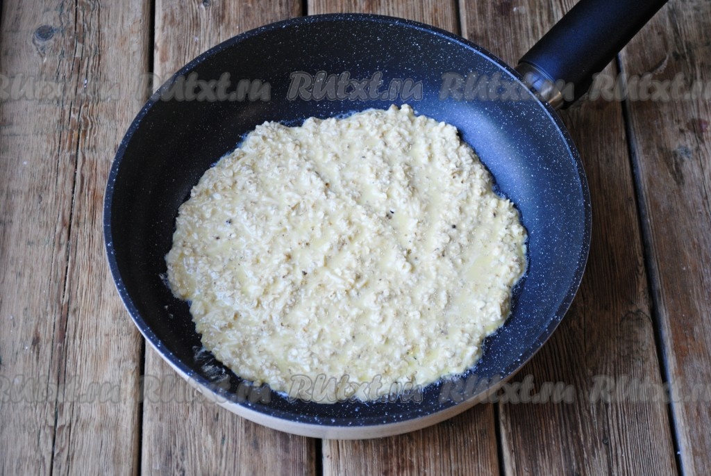 Готовый блин переложить на блюдо и сразу присыпать натёртым сыром (сыр на тёплом овсяноблине должен немного расплавиться).