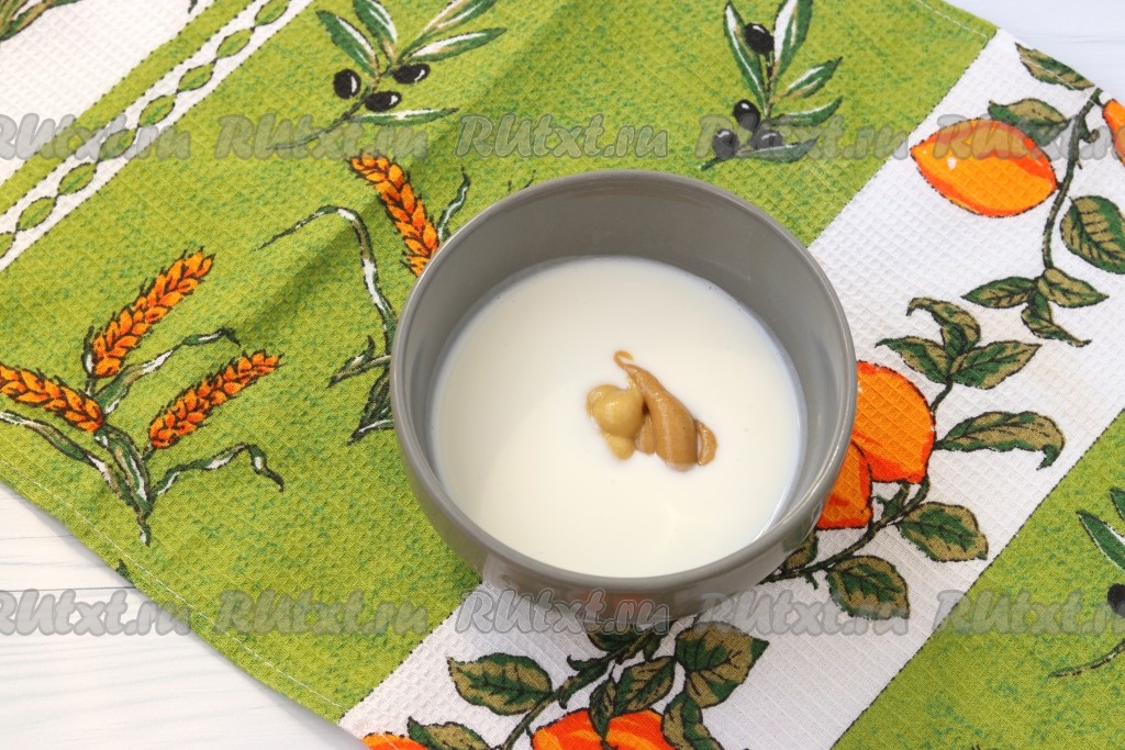 В пиалу налить небольшое количество кефира (около стакана), добавить горчицу и тщательно размешать. Таким образом горчица лучше распределится в кефире.