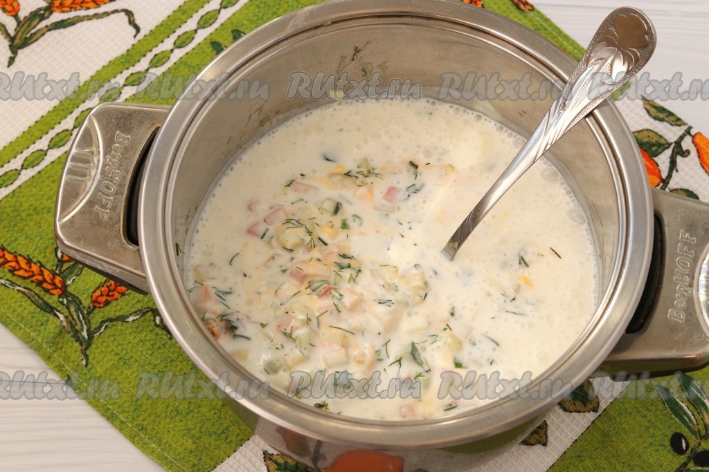 Вылить в кастрюлю оставшийся кефир и снова тщательно перемешать окрошку.