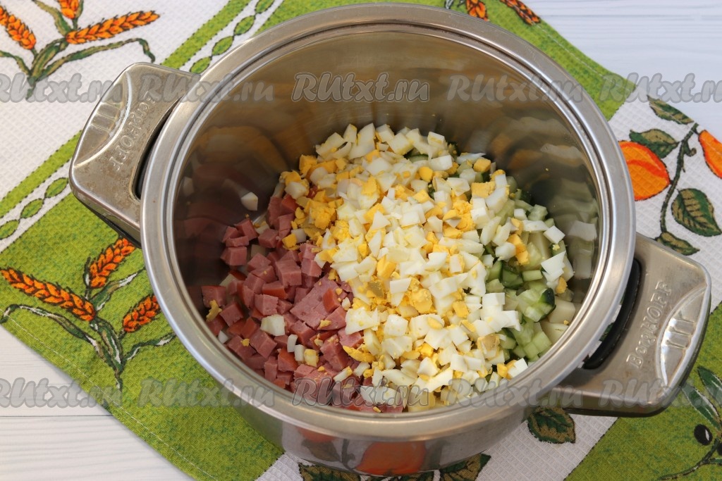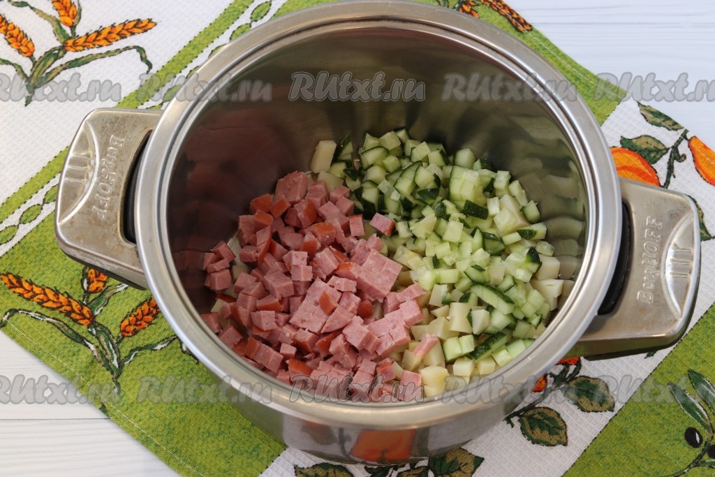 Очистить варёный картофель, нарезать кубиками. Также нарезать колбасу и огурцы. Некоторые хозяйки очищают огурцы от шкурки, но я думаю, это нужно делать только в тех случаях, когда шкурка достаточно грубая. Сложить нарезанные картофель, огурцы и колбасу в кастрюлю.