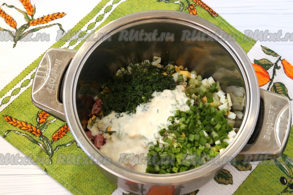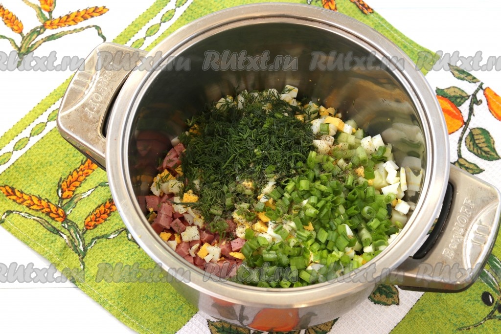 Измельчить укроп и зелёный лук, добавить их к остальным нарезанным ингредиентам.