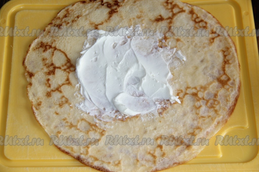 Серединку каждого блинчика смазать творожным сыром. Если у вас нет творожного сыра, то можете пропустить этот этап.