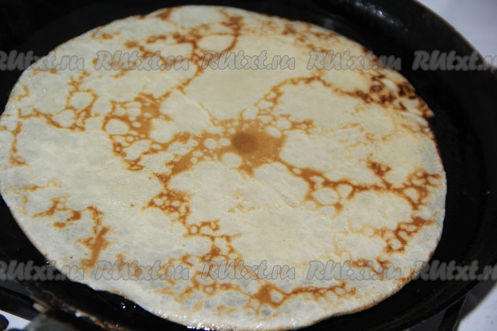 Жарить тонкие блины с двух сторон до золотистого цвета на разогретой сковороде на среднем огне. Перед жаркой первого блина нужно смазать сковороду тонким слоем растительного масла, далее продолжаем готовить блины, уже не смазывая сковороду (в блинное тесто мы добавили растительное масло, оно не будет давать прилипать блинам к сковороде).