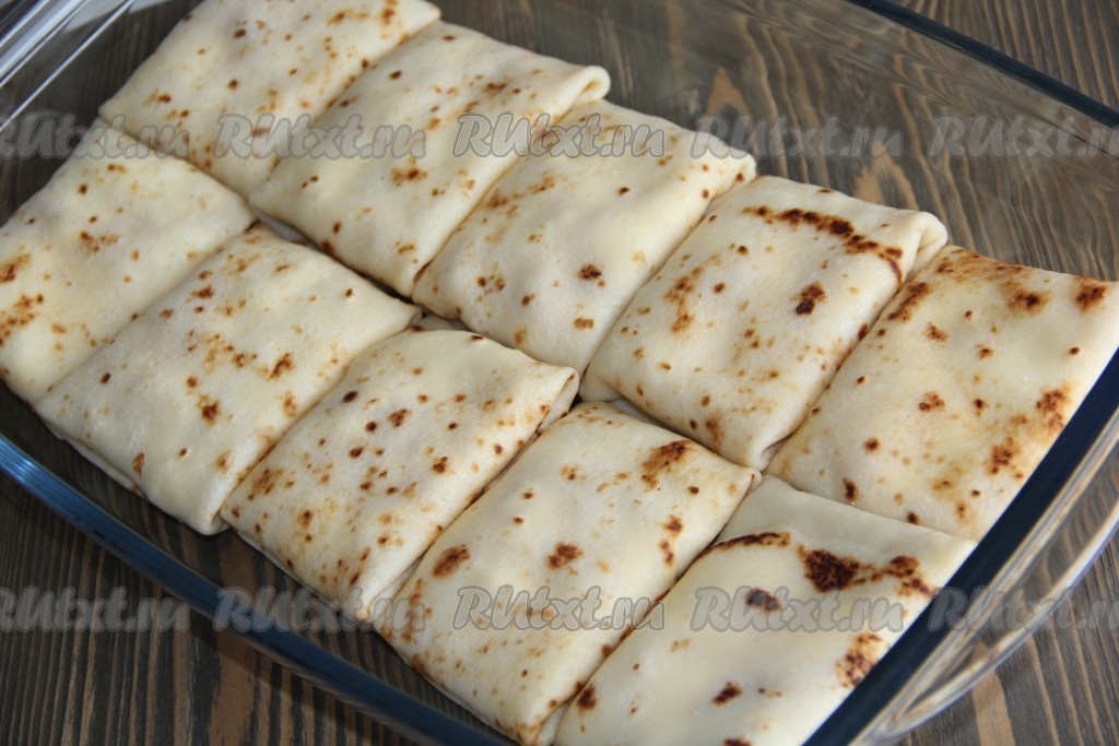 Блины, фаршированные сыром и курицей, выложить в жаропрочную форму.