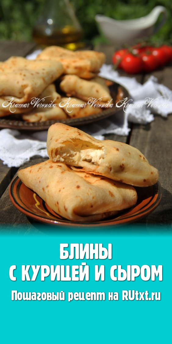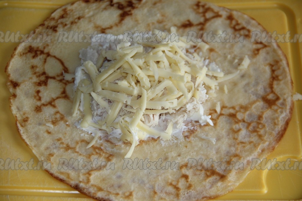 Сытные, вкусные блины с начинкой из курицы и сыра подаём в горячем виде. Отличное блюдо для всей семьи, попробуйте!