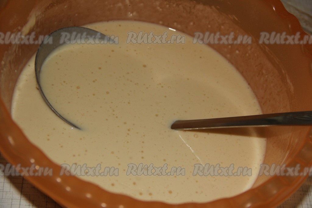 В молоко всыпать соль, сахар, добавить яйца. Слегка перемешать, затем добавить муку. Перемешать венчиком до однородного состояния. В конце влить растительное масло и ещё раз перемешать. Тесто получится не густое.