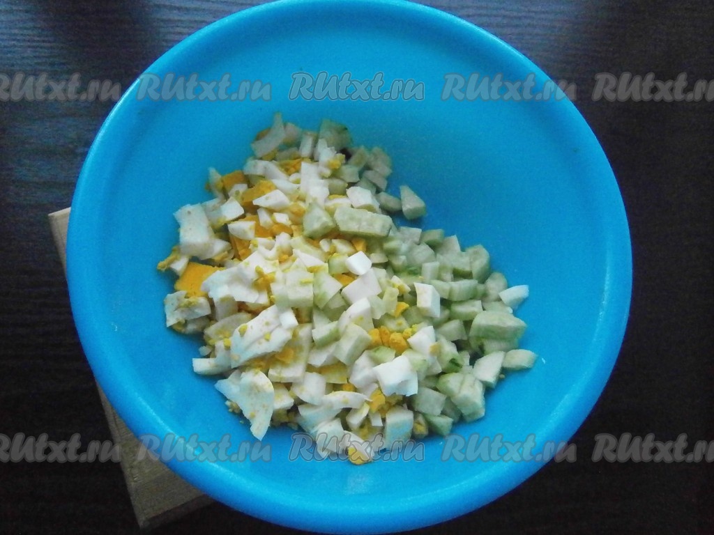 Свежий огурец очистить от кожицы, нарезать на небольшие кубики и выложить в миску. Добавить к огурцам очищенные яйца, нарезанные на кубики такого же размера.