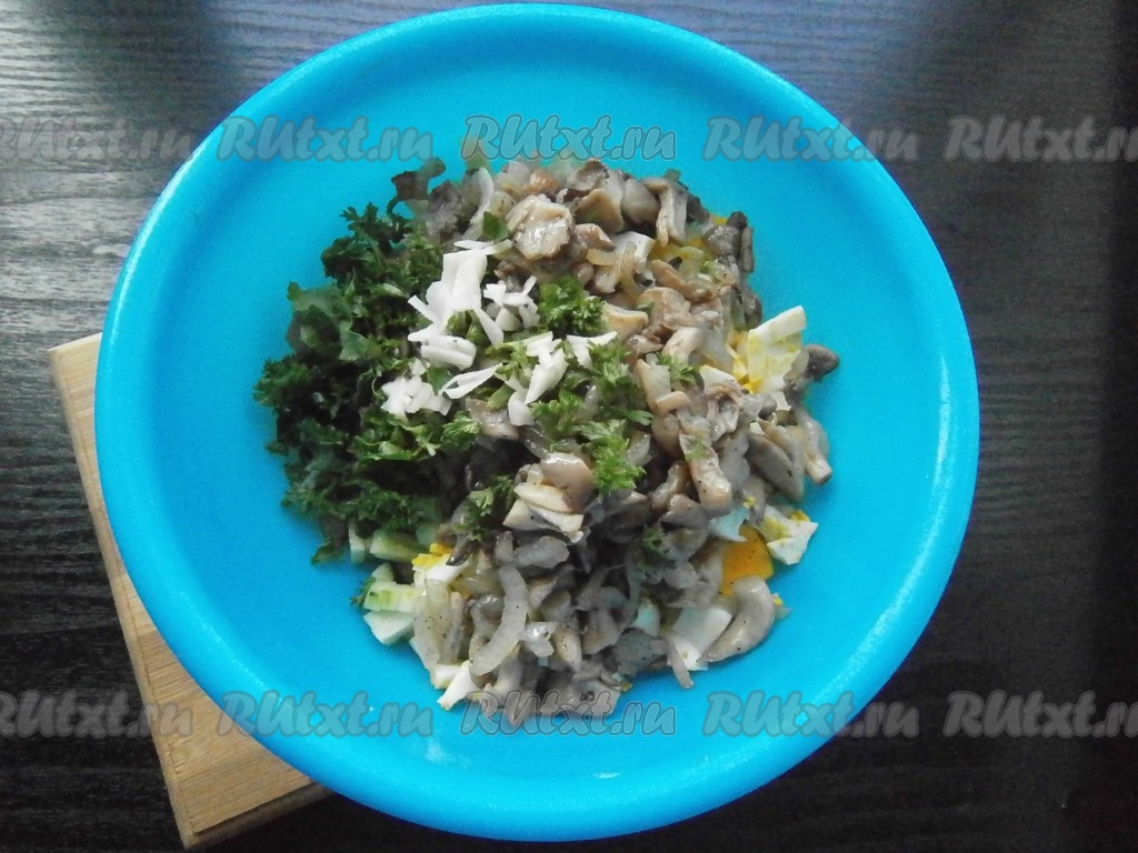 Сюда же добавить остывшие грибы с луком, измельченную петрушку и нарезанный мелко очищенный чеснок.