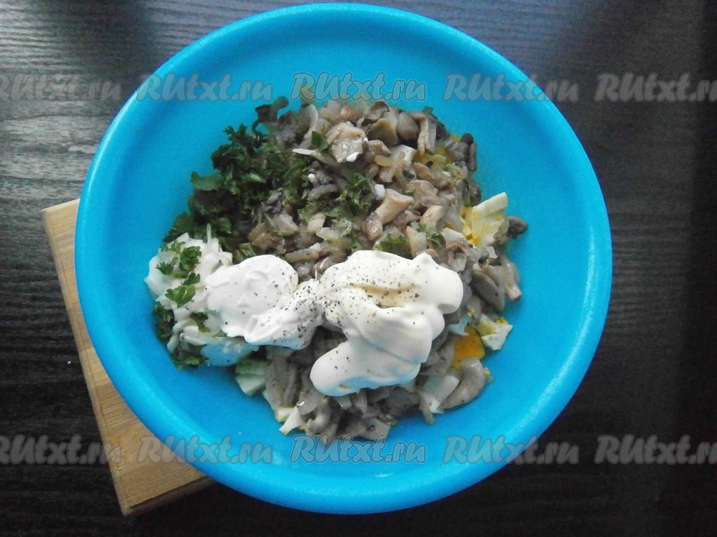 Также добавить сметану и майонез, салат посолить и поперчить, перемешать.