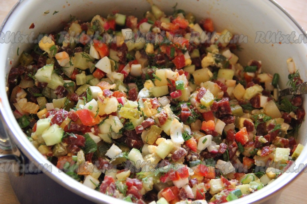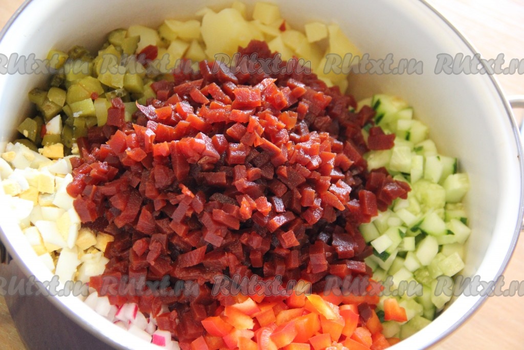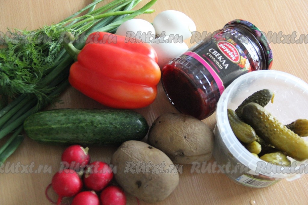 Соединить в кастрюле маринованную свеклу, картошку, яйца, солёные и свежие огурцы, редис, болгарский перец.