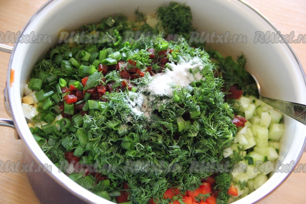 Добавить зеленый лук, укроп и соль.