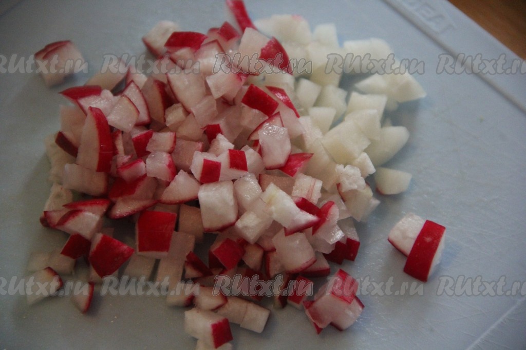 Редис вымыть и мелко нарезать.