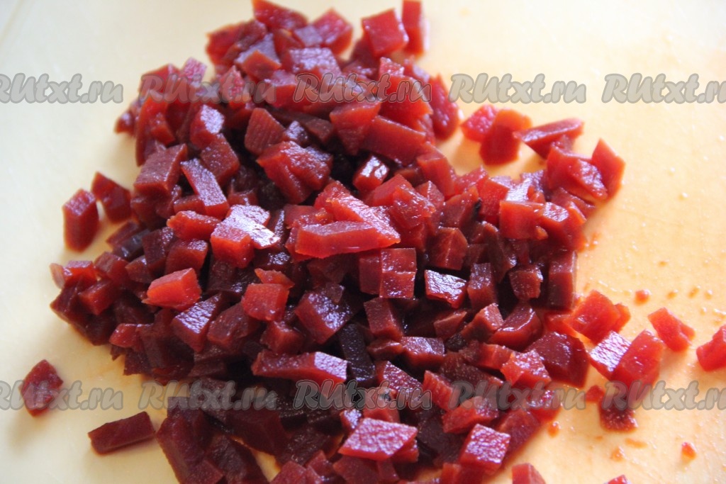Маринованную свеклу нарезать на кубики такого же размера, как мы нарезали и остальные овощи. Маринад со свеклы слить и отставить в сторону, он понадобится нам для заправки холодного борща.