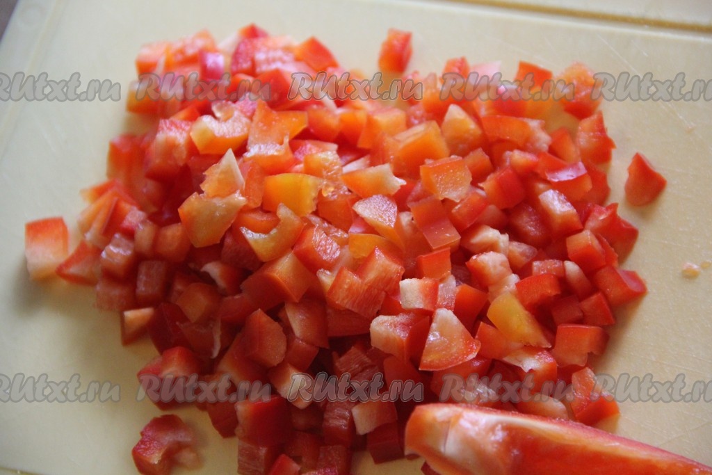 Болгарский перец вымыть, удалить плодоножку с семенами и нарезать на кубики.