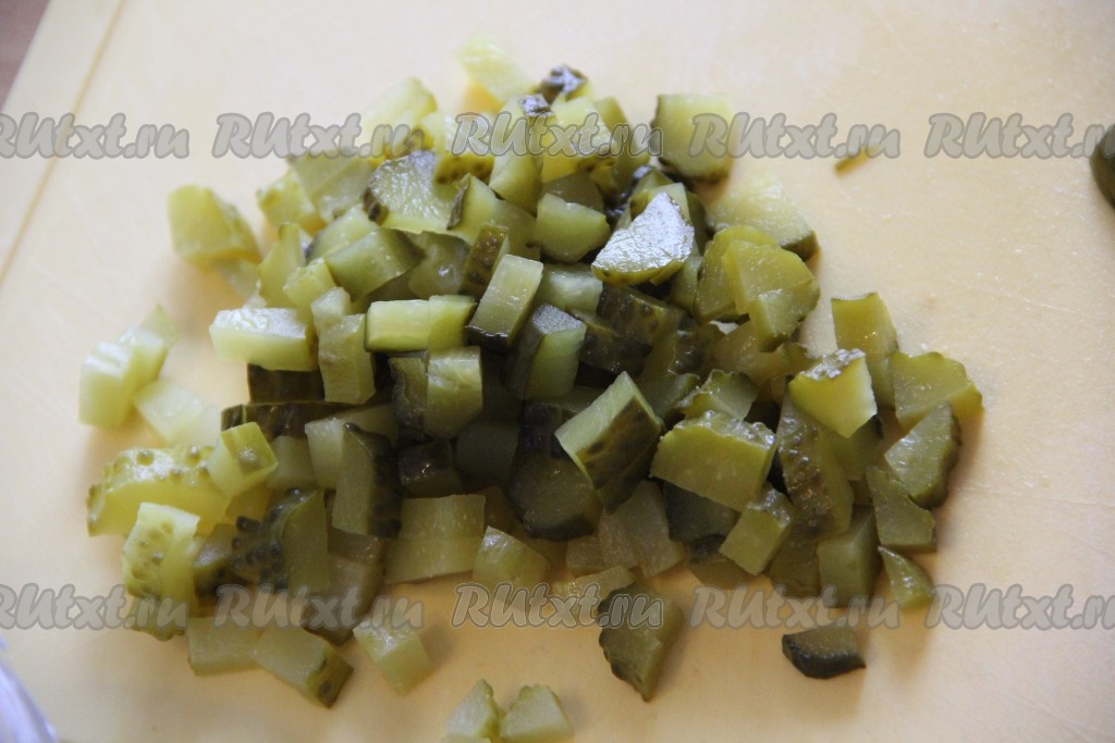 Солёные огурчики нарезать на кубики.