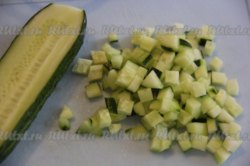 Свежий огурец вымыть и нарезать на кубики. Желательно все овощи нарезать на кубики, приблизительно, одинакового размера.