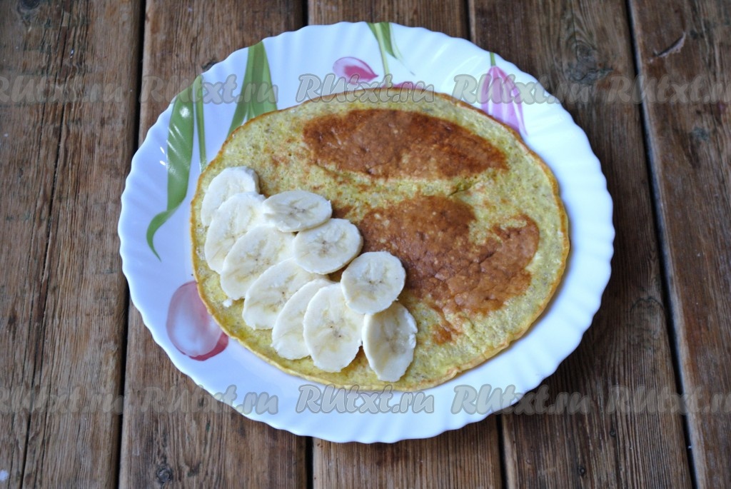 Готовый блин переложить на блюдо. Оставшуюся половину банана выложить на одну половину блина, накрыть второй половиной блина.