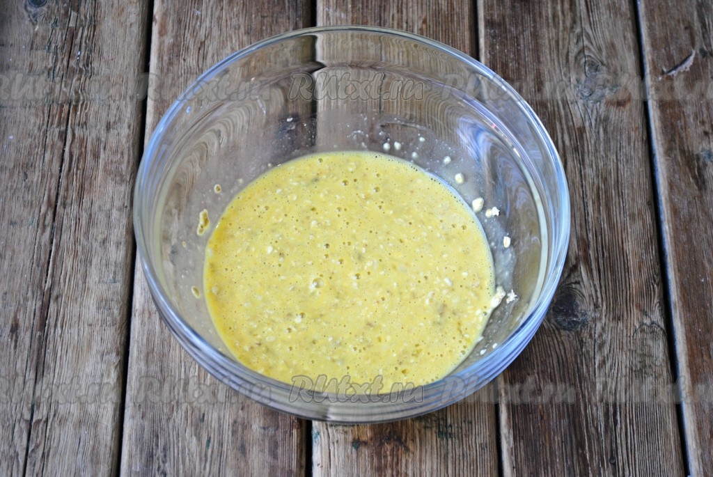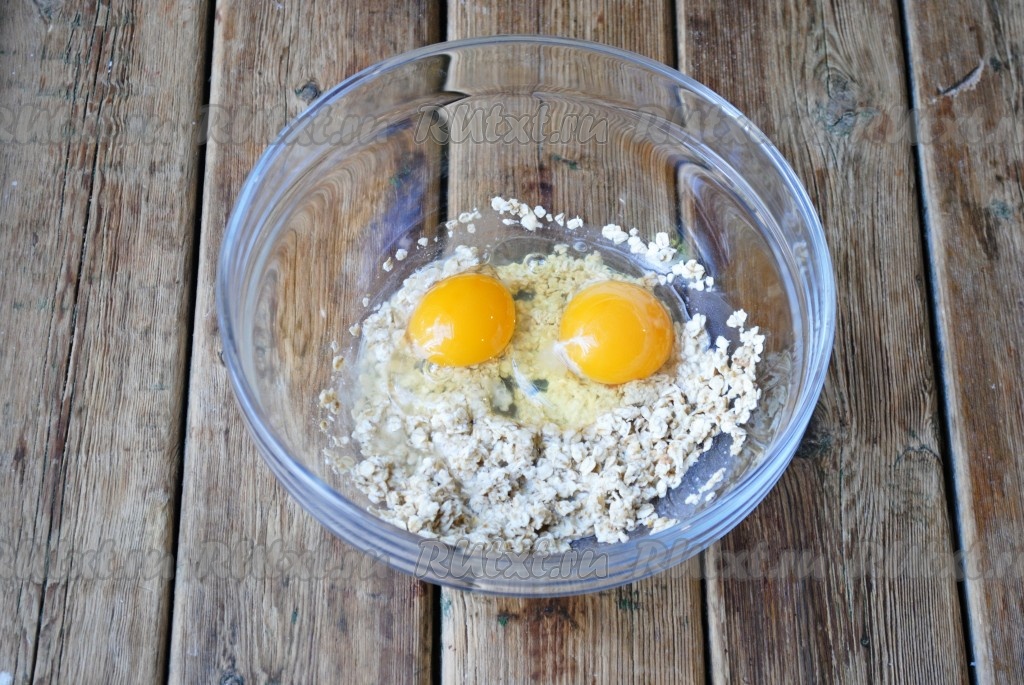 К набухшим хлопьям вбить яйца и перемешать.