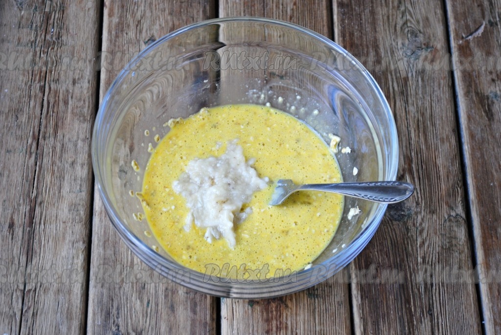 Затем добавить щепотку соли и кашицу банана, перемешать.