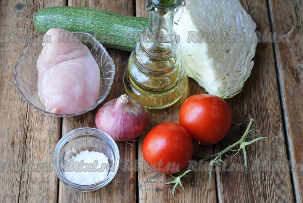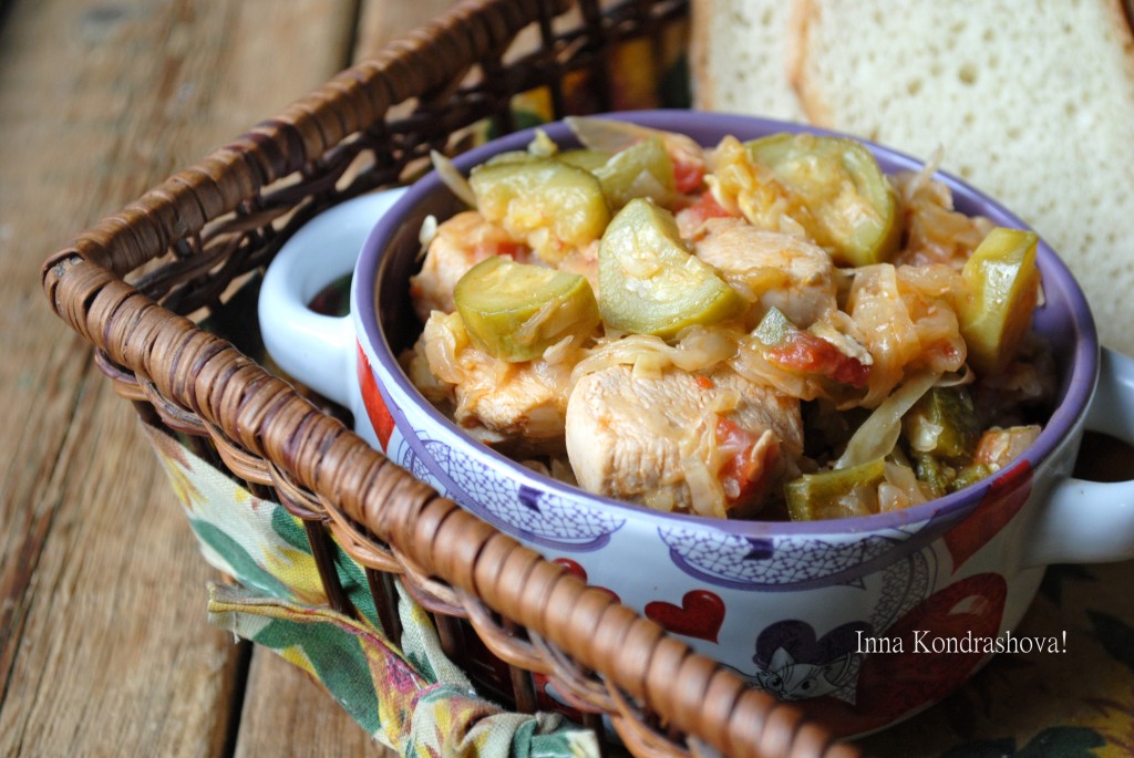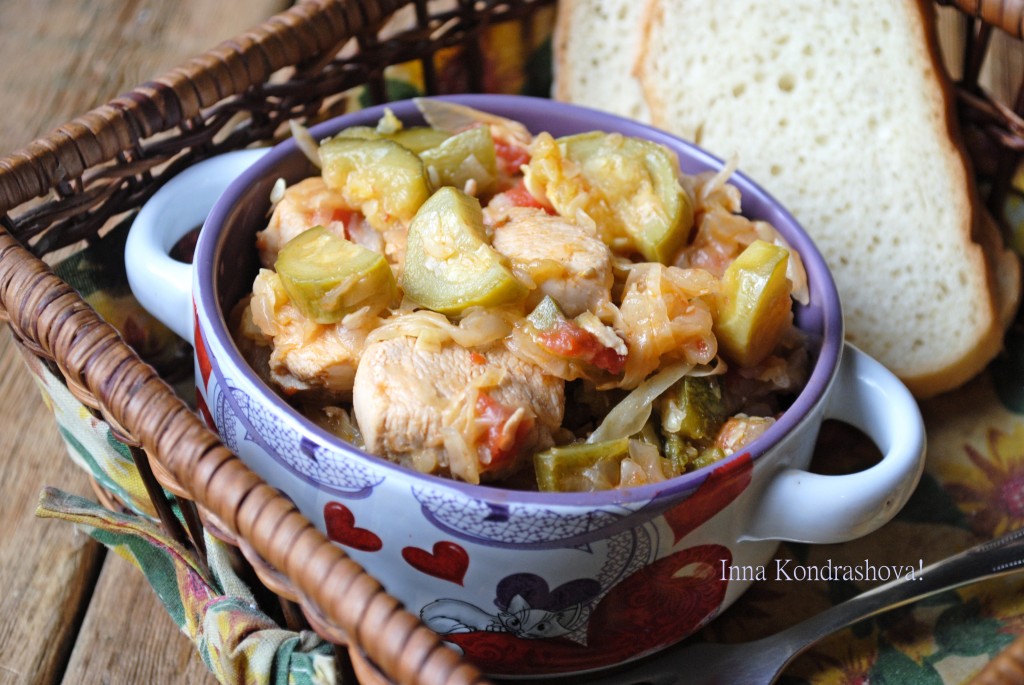 Овощные блюда я готовлю достаточно часто, сочетая между собой различные ингредиенты. В этот раз предлагаю приготовить капусту, тушёную с курицей и кабачками. Блюдо получается очень вкусным, сочным, аппетитным и сытным. И, что немаловажно, потратив совсем немного усилий, мы одновременно приготовим и мясо, и гарнир к нему. Это блюдо лучше подавать к столу тёплым, дополнив, по желанию, белым хлебушком. Очень вкусно, попробуйте!
