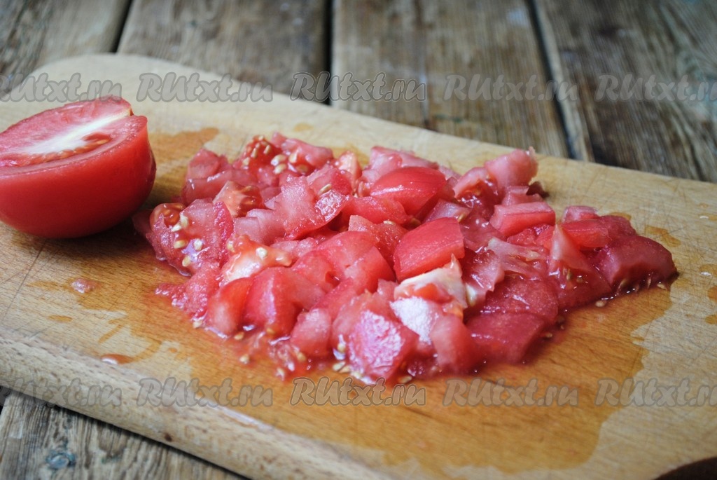 Помидоры вымыть. На каждом помидорчике сделать крестообразный разрез. Залить помидоры кипятком так, чтобы они были полностью погружены в воду, оставить на 1 минуту. Затем помидоры обдать холодной водой и снять кожицу. Мякоть нарезать на небольшие кубики.