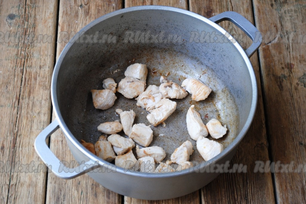 Куриное филе вымыть, обсушить, нарезать на небольшие кусочки одинакового размера. В казане (сковороде или толстостенной кастрюле) разогреть растительное масло и выложить кусочки мяса.