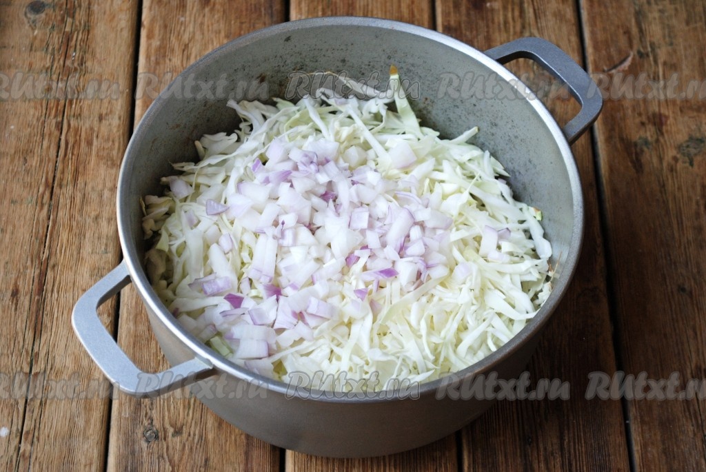 Когда курица обжарится, выложить к мясу капусту и лук, потомить 5 минут на среднем огне, периодически помешивая.