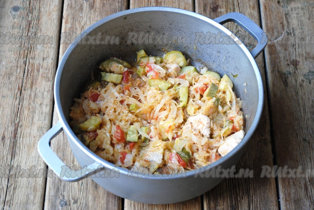 Накрыть казан (кастрюлю или сковороду) крышкой и тушить капусту с курицей и кабачками на медленном огне под крышкой около 30 минут, иногда перемешивая.