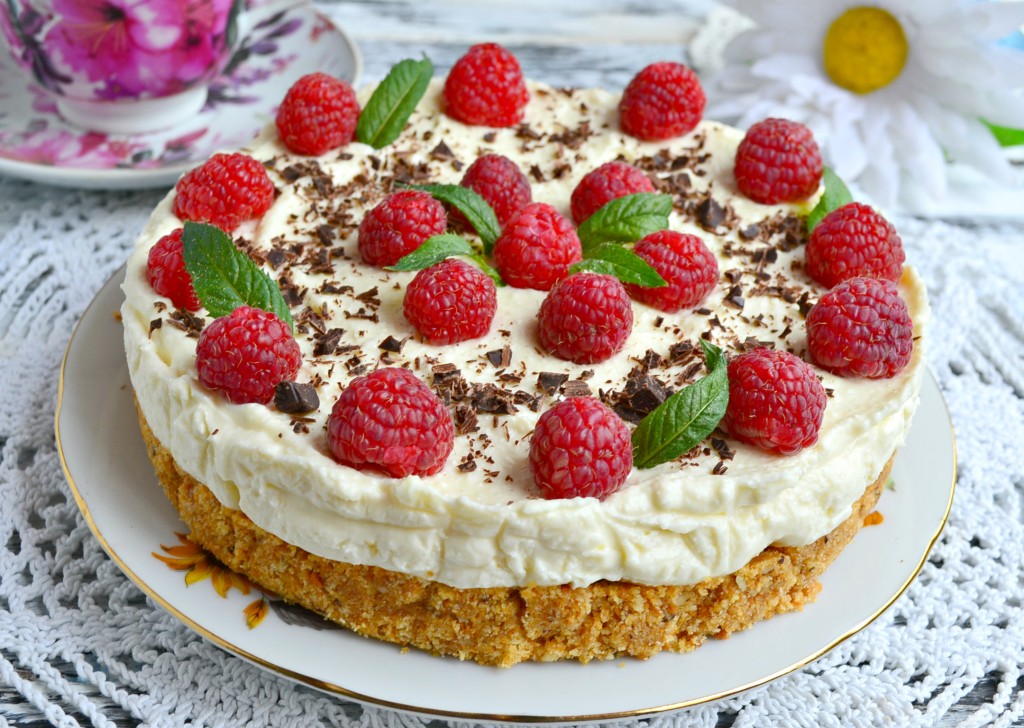 Снова отправить форму в морозилку на 1 час, после чего переставить её в холодильник ещё на пару часов. Украсить сверху замечательный чизкейк, приготовленный с малиной и творогом без выпечки, оставшимися ягодами малины. Я ещё украсила листиками мяты и тёртым шоколадом.
