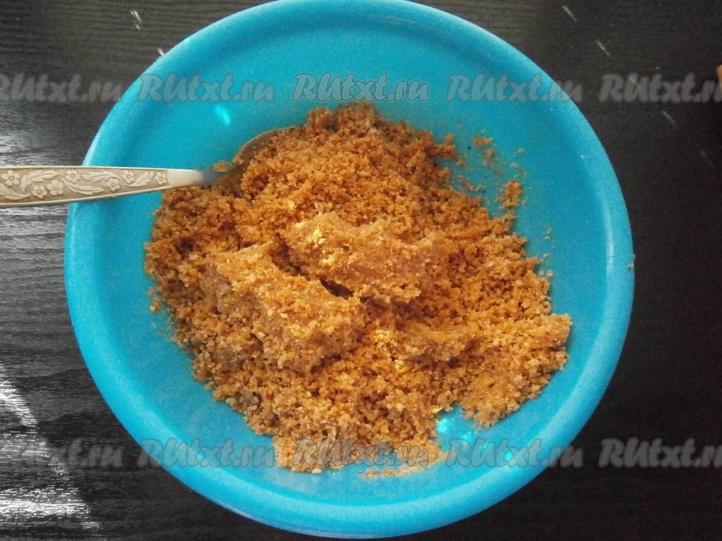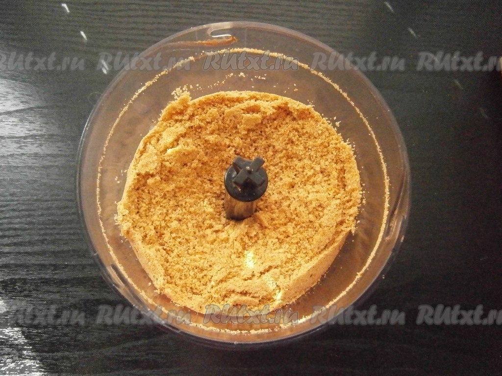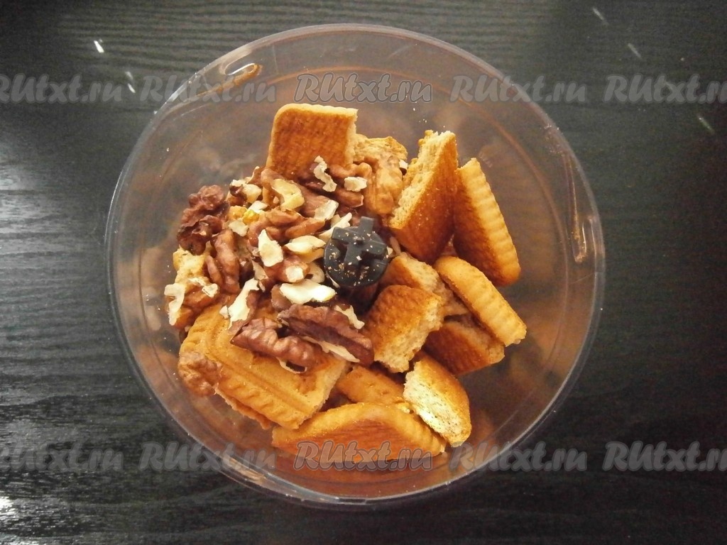 Измельчить орехи с печеньем до состояния крошки. Если нет измельчителя, можно сложить печенье в плотный целлофановый пакет и прокатать поверх пакета скалкой до превращения печенья в крошку, а затем пересыпать крошку из печенья в миску, добавить мелко нарезанные орехи, перемешать. Можно орехи и вовсе не добавлять.