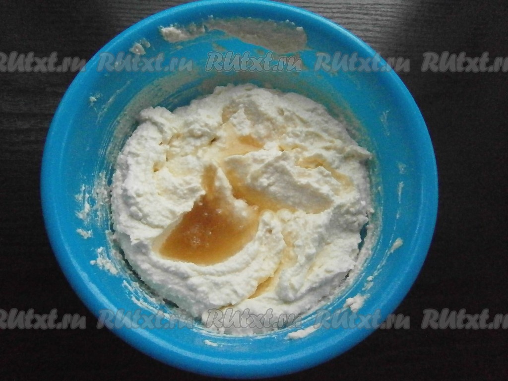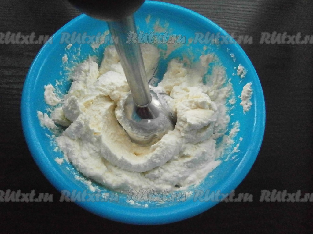 Желатин в небольшой ёмкости залить 3 столовыми ложками воды комнатной температуры, перемешать и оставить на 10 минут, после чего его растопить на водяной бане, не доводя до кипения. Дать немного остыть и вылить его в творожную массу. Ещё раз пробить творожную массу погружным блендером.