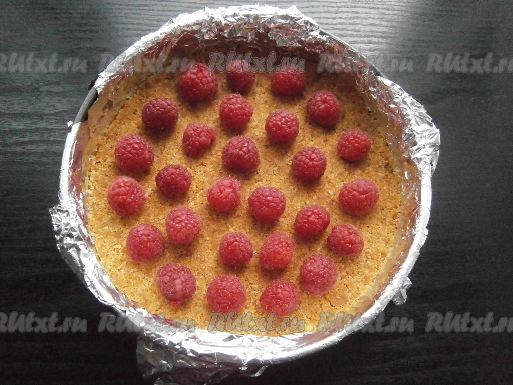 Достать из морозилки форму с крошкой, на застывший корж выложить половину малины.