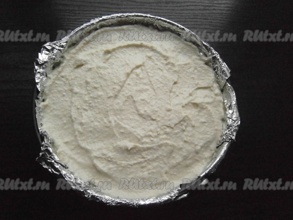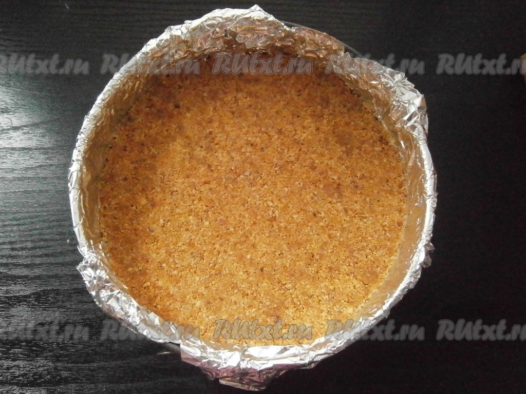 Разъёмную форму диаметром 18-19 сантиметров застелить пищевой плёнкой (или фольгой), чтобы концы свисали с краёв формы. Выложить крошку с маслом и хорошо её утрамбовать по дну. Поместить форму в морозилку на 30 минут.