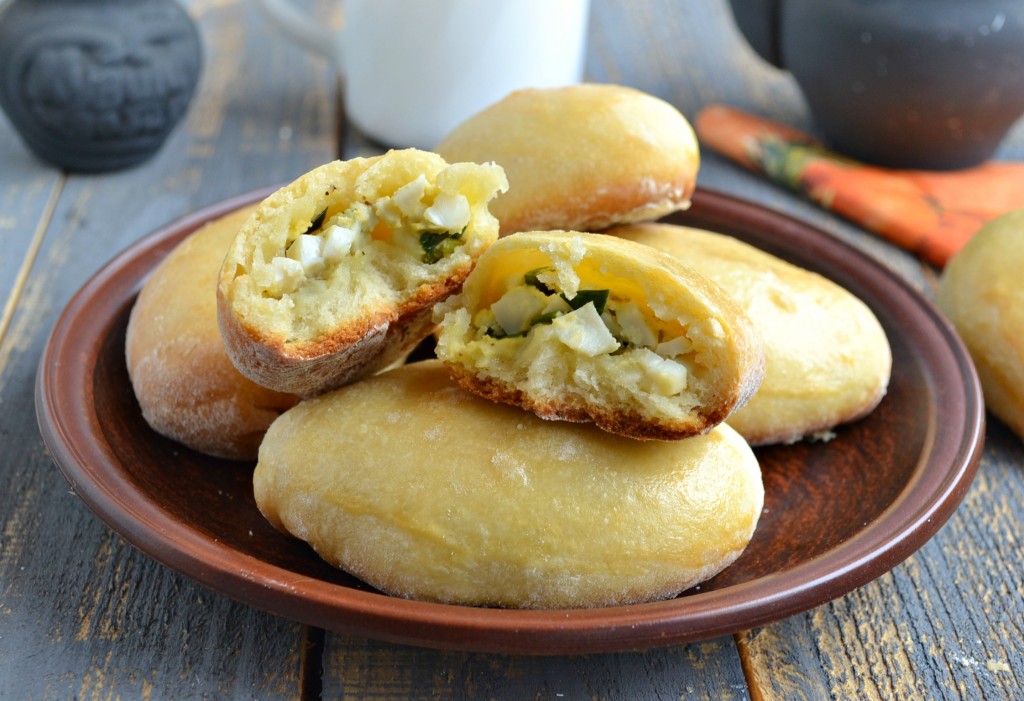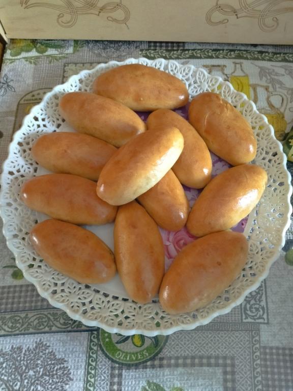 Выпекать пирожки в разогретой до 180 градусов духовке 20 минут, после чего вынуть и смазать их яйцом, предварительно взбитым вилкой с 30 мл молока.