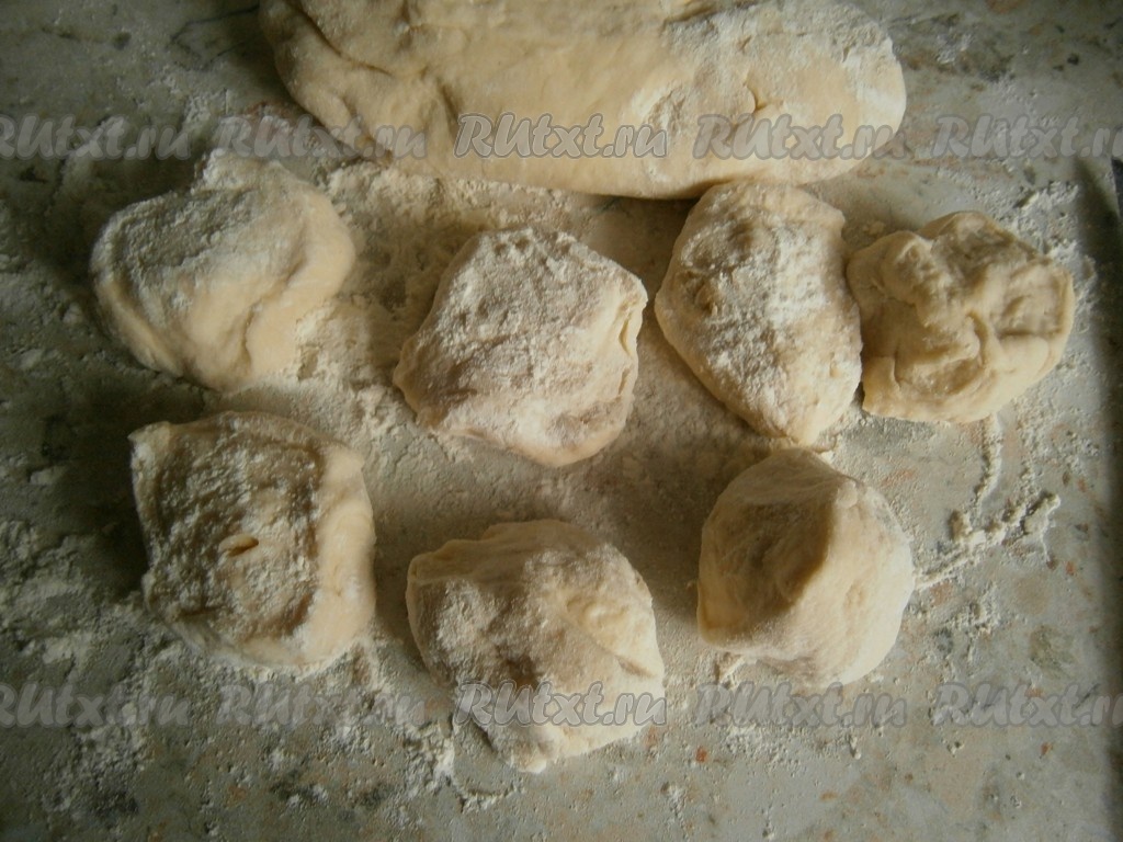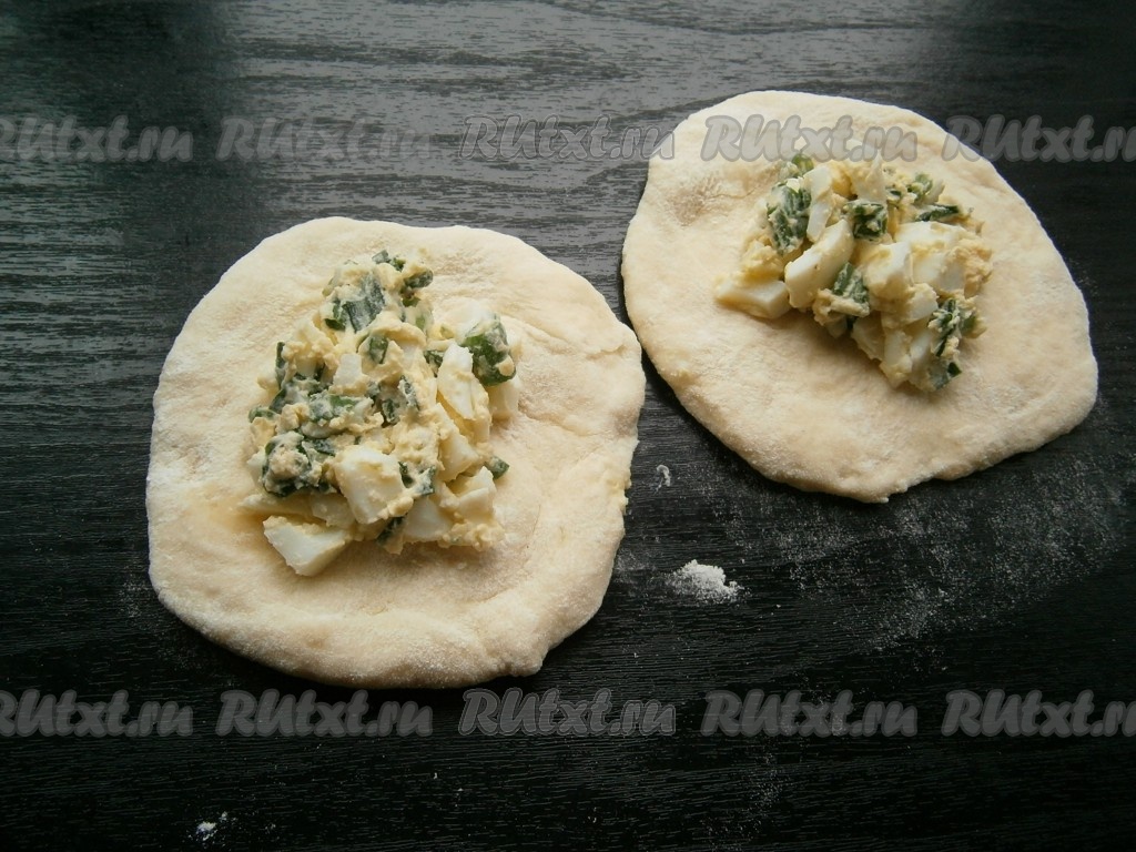 Каждую часть теста приплюснуть в лепешку диаметром около 8 см. В середину выложить по 1-2 столовых ложки начинки.