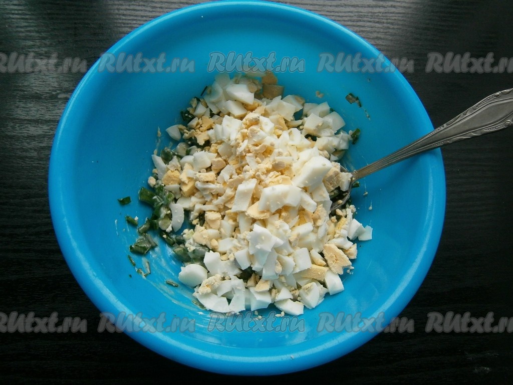 Сюда же добавить рубленные вареные яйца, перемешать и начинка для пирожков готова. Пропорция зеленого лука и яиц зависит от ваших предпочтений - можете добавлять чего-то больше, чего-то меньше.