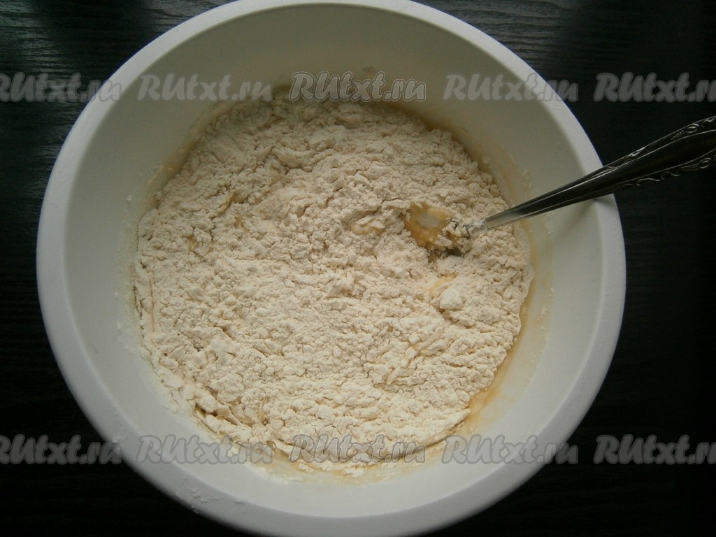 В смесь кефира, масла и сахара всыпать муку частями, замешивая тесто.