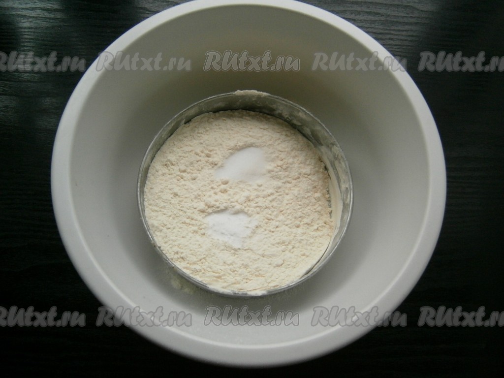 Муку просеять 2 раза, всыпать в нее соль и соду, просеять все вместе еще раз в миску.