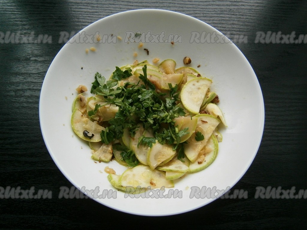 Готовые, чуть хрустящие кабачки перемешать с измельченной зеленью петрушки.