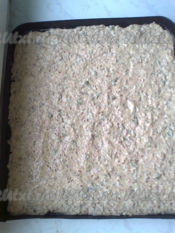 Вылить получившуюся смесь на стандартный противень, смазанный растительным маслом, или на силиконовый коврик и разровнять ложкой или шпателем по всему противню или коврику.