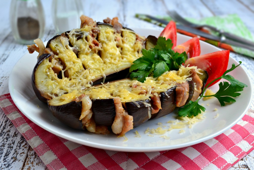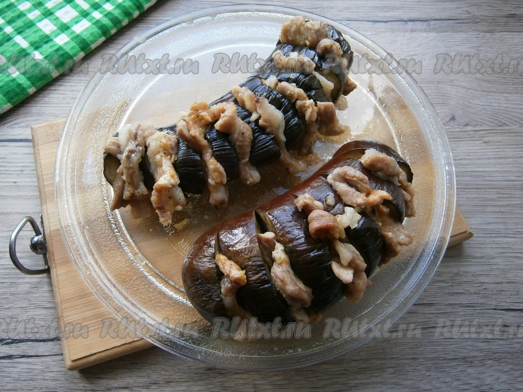В каждый разрез баклажанов вложить по кусочку бекона.