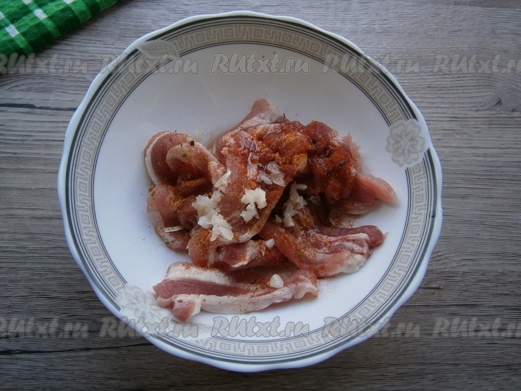 Каждую пластину бекона разрезать на 3 части, добавить специи для мяса, немного соли, паприку, растительное масло и пропущенный через пресс чеснок, перемешать и оставить на 30 минут.