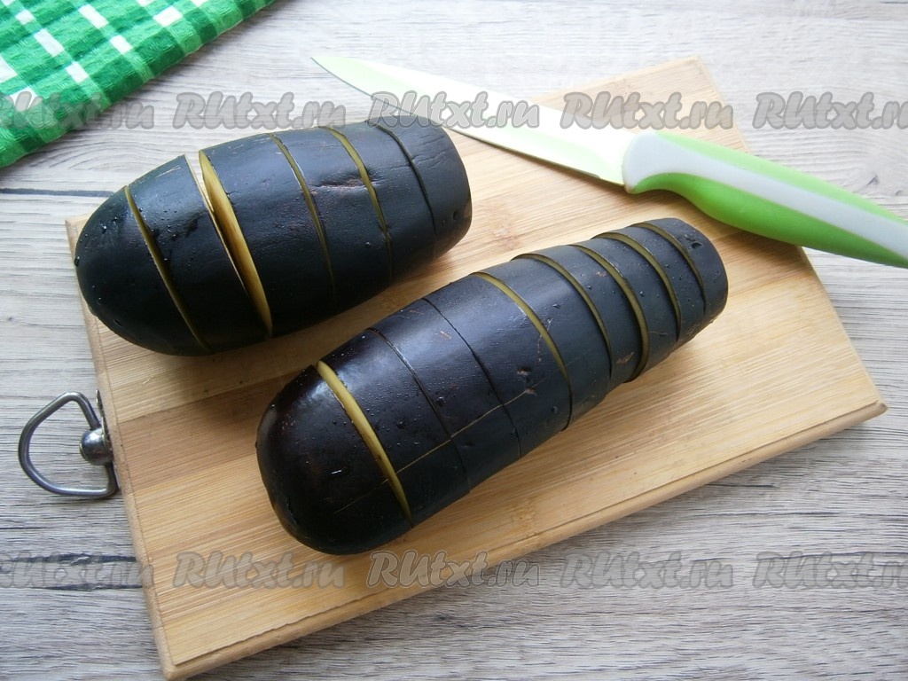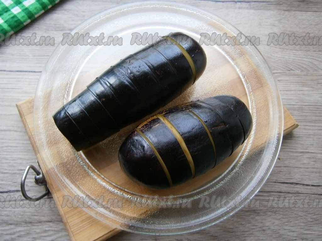 Баклажаны вымыть, сделать на них поперечные надрезы, но не до конца (как на фото).