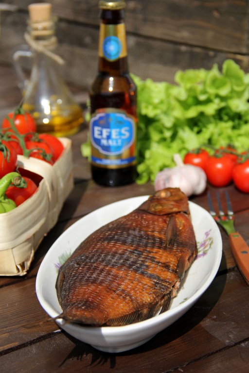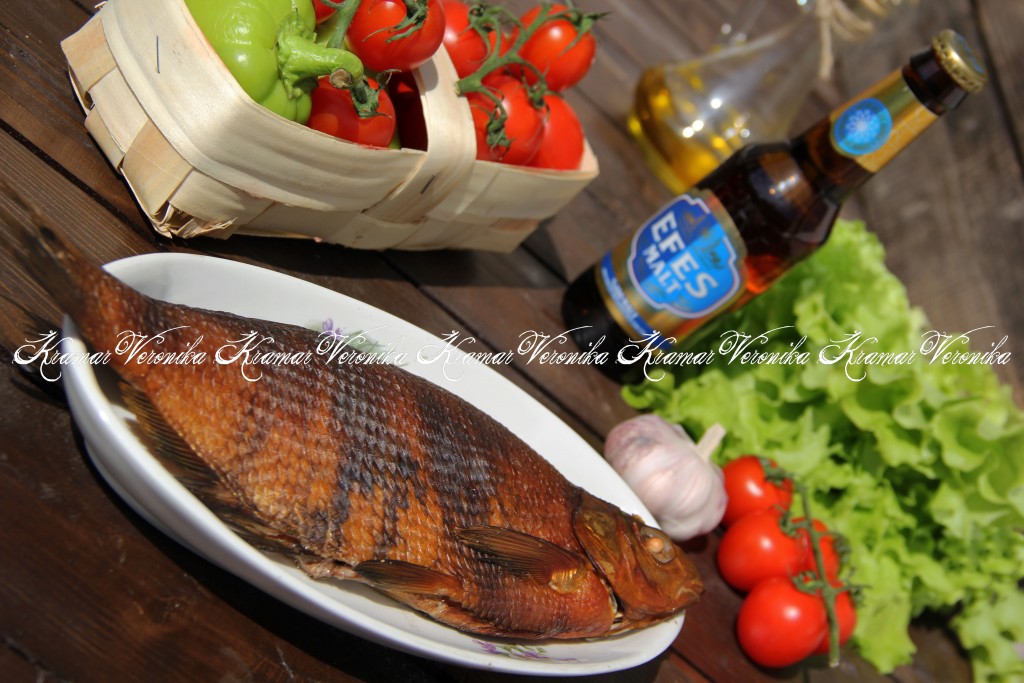 Коптить леща от 15 до 30 минут - в зависимости от размера рыбы и жара мангала. Можно приоткрывать крышку коптильни и проверять цвет рыбы. Рыбка должна приобрести красивый, насыщенный цвет (она не должна быть блёклой). Готового леща переложить на тарелку. Вот такая красивая и очень вкусная рыбка у нас получилась. Подать леща горячего копчения со свежими овощами.